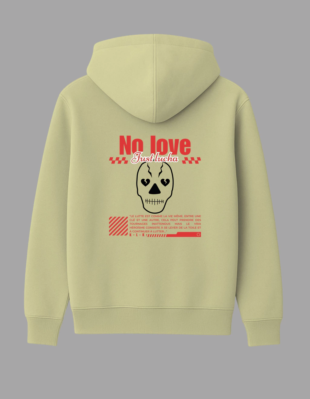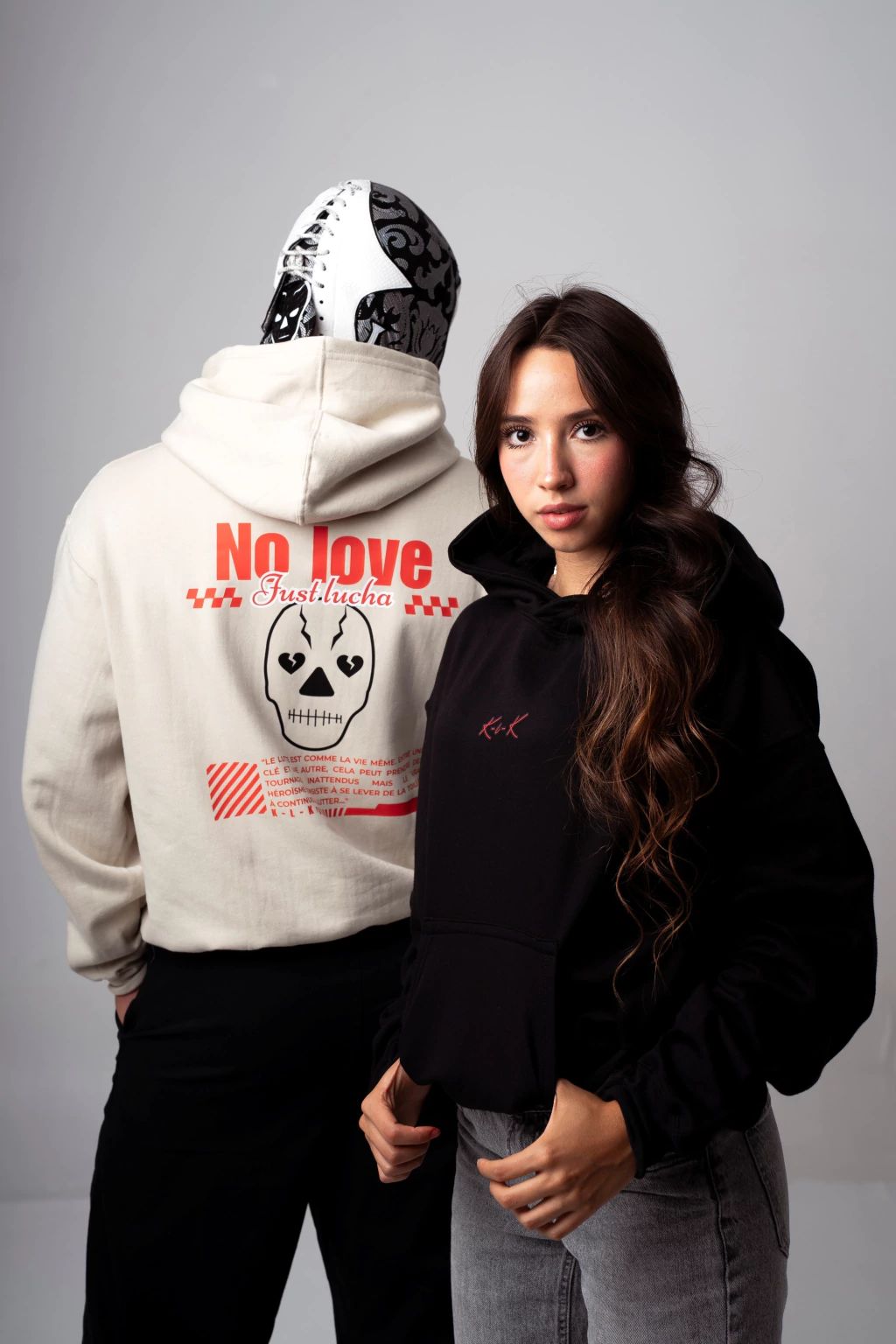 Confeccionada en un suave y cómodo tejido, esta sudadera color hueso o beige claro te ofrece la calidez perfecta para cualquier ocasión. Su diseño principal en la espalda presenta una impactante calavera con ojos de corazón, rodeada por el audaz lema "No love Just lucha" en vibrante rojo. Los detalles en patrón de cuadros de lucha libre y un texto adicional en francés que rinde homenaje a la lucha, añaden un toque de originalidad y profundidad a la pieza.